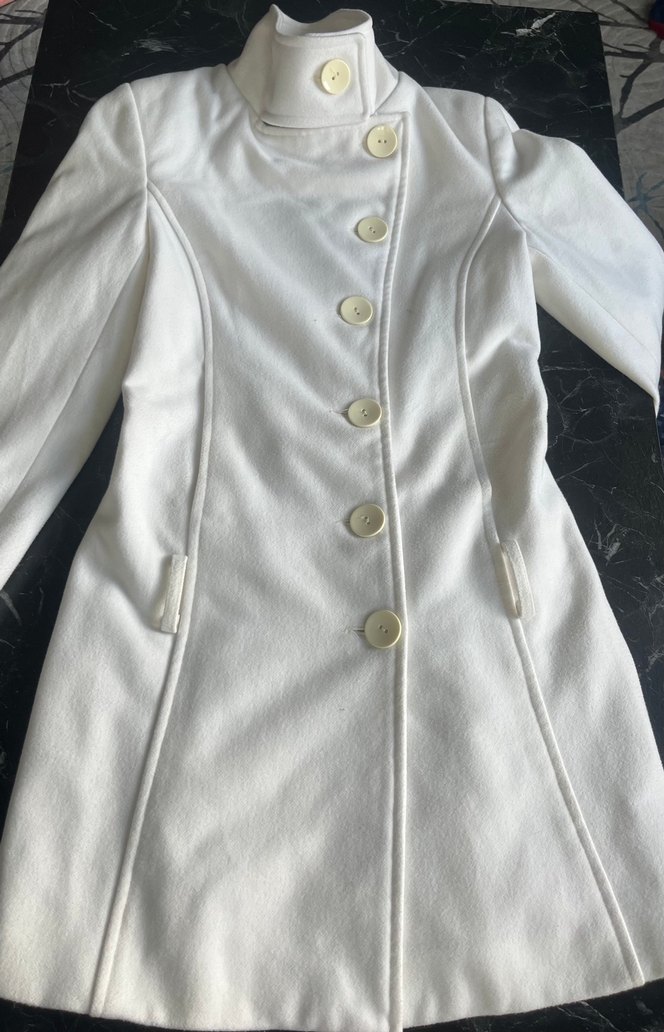 Düğmeli ön kısmı, keskin yaka ve uzun kollu beyaz, vücuda oturan midi kaban. yumuşak dokulu kumaştan