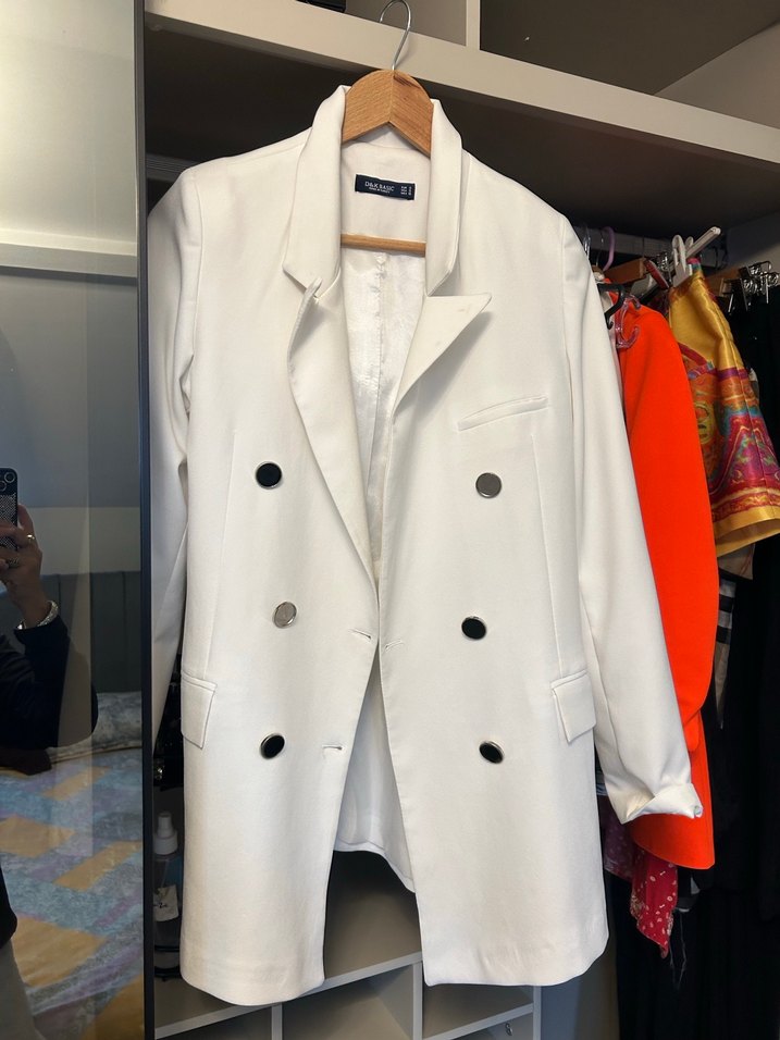 Düğmeli Beyaz Midi Kadın Blazer Ceket