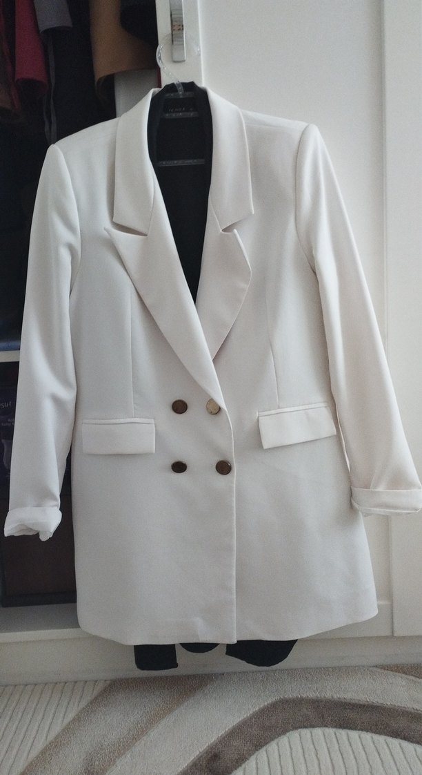 Düğmeli beyaz kadın blazer ceket, kesik yakalı ve uzun kolludur. Midi boyda, rahat kesim ve sentetik kumaştan üretilmiştir. Ofis için klasik ve şık bir modeldir.