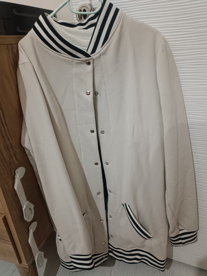 Düğmeli, uzun kollu beyaz midi ceket. Gevşek kesim, çentik yaka ve yakada, manşetlerde çizgili detaylar bulunur. Sentetik kumaştan, günlük rahat stil için uygun.