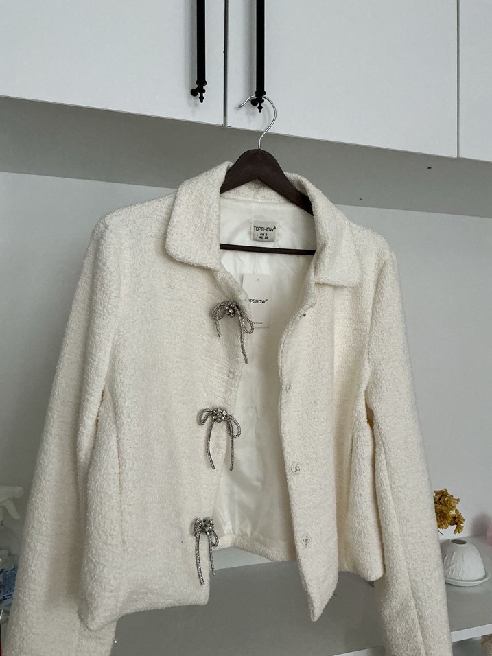 Düğmeli, yakalı ve bol kesimli beyaz midi ceket, yumuşak ve sıcak kumaştan yapılmıştır, günlük kullanım için uygundur. Hiç giyilmedi etiketi üzerinde hediye olarak alınmıştı. Taşlarında eksik yok kusursuz duruyor
