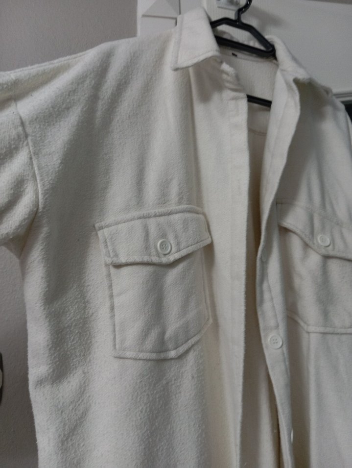 Beyaz renkli, midi uzunlukta kadın ceket, uzun kollu ve kesimli yakaya sahiptir. Düğmeli ve bol kesim olan bu minimalist stil, günlük sokak giyimi için uygundur.