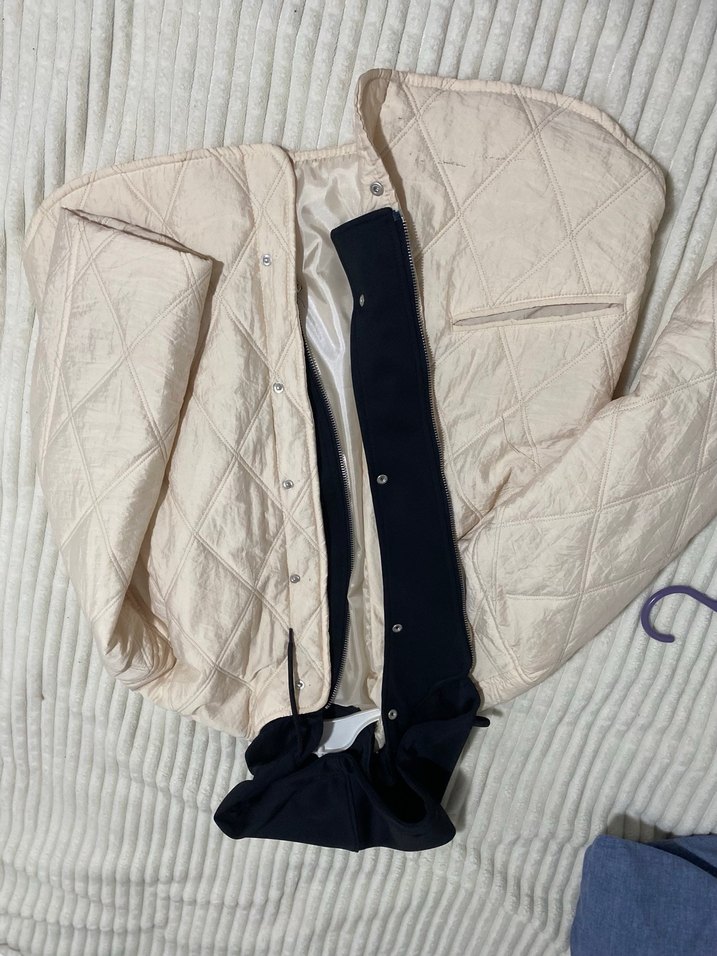 Beyaz, düğmeli, notlu yakalı ve salaş kesim kadın ceketi. Yumuşak sentetik kumaştan, midi boyda ve askılı kollu. Rahat sokak stili için uygun. ✨