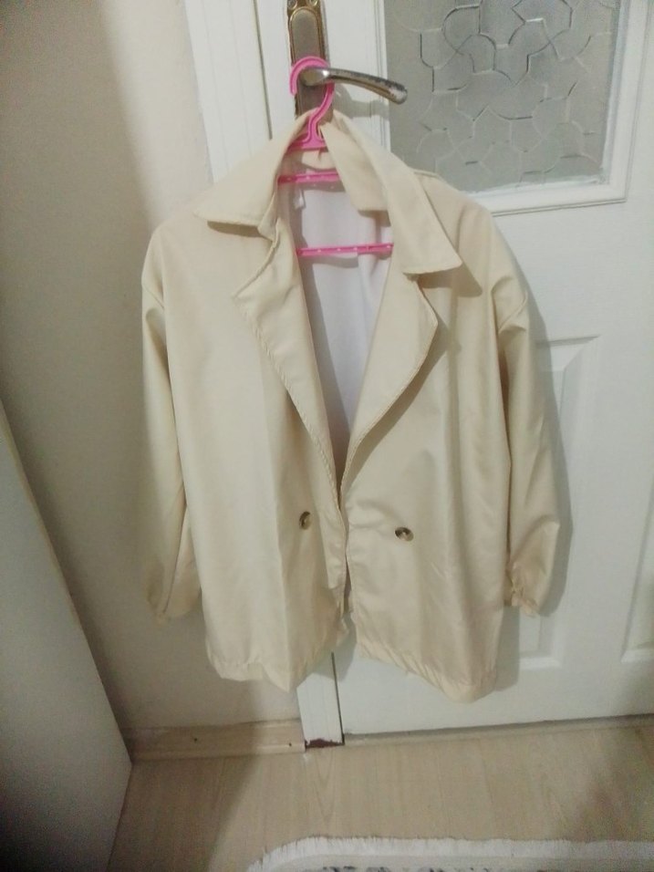 Düğmeli, notched lapel yakalı, uzun kollu beyaz kadın ceket. İpek gibi dokusu ve midi boyuyla rahat, salaş bir görünüme sahip. hiç giyilmedi. kendime yakistiramadim