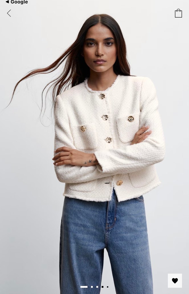 Düğmeli, beyaz midi kadın ceketi, keskin yakalı ve uzun kolludur. Yumuşak denim kumaştan yapılmış, sade ve desensiz tasarıma sahiptir. Günlük kullanıma uygundur.