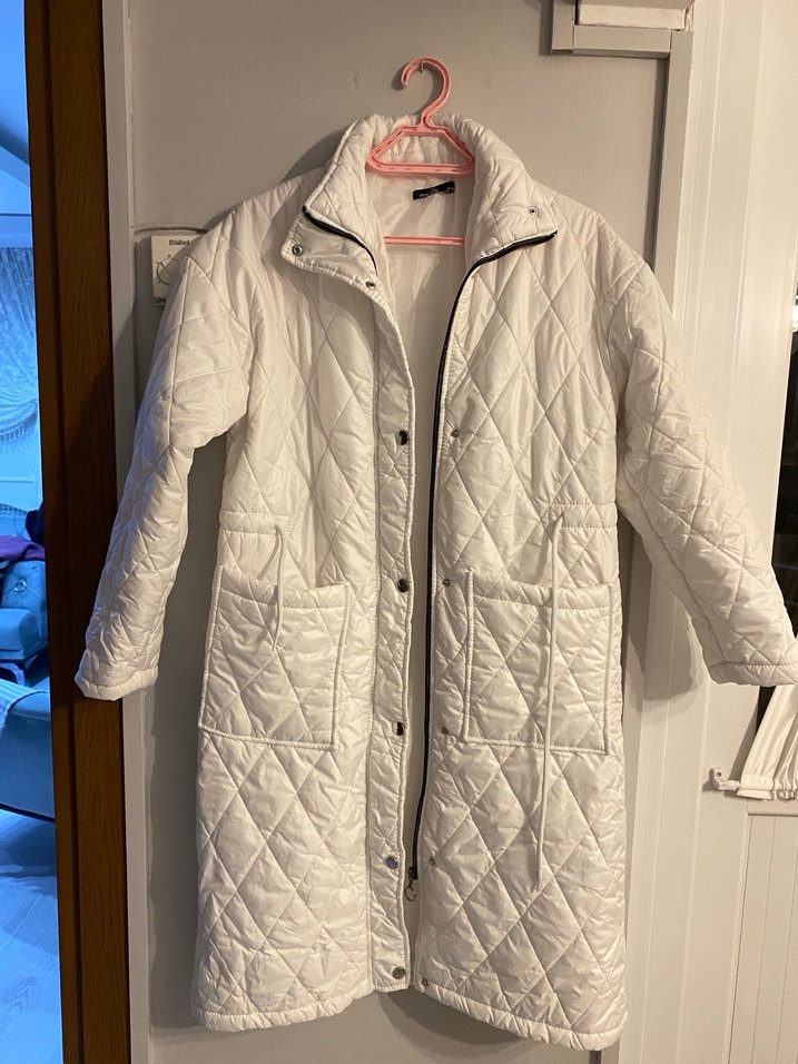 Düğmeli, beyaz, pamuklu, kapitone desenli midi uzunlukta kadın ceket. Notlu yaka ve uzun kollu, rahat kesimle sokak stiline uygun sıcak bir tasarım.
