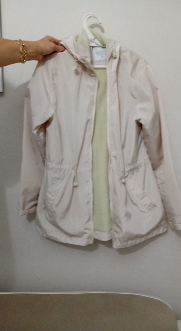Düğmeli, uzun kollu, beyaz midi ceket. Sentetik kumaştan, bol kesim ve çıtçıtlı. Minimalist ve dış mekan kullanımı için uygun.