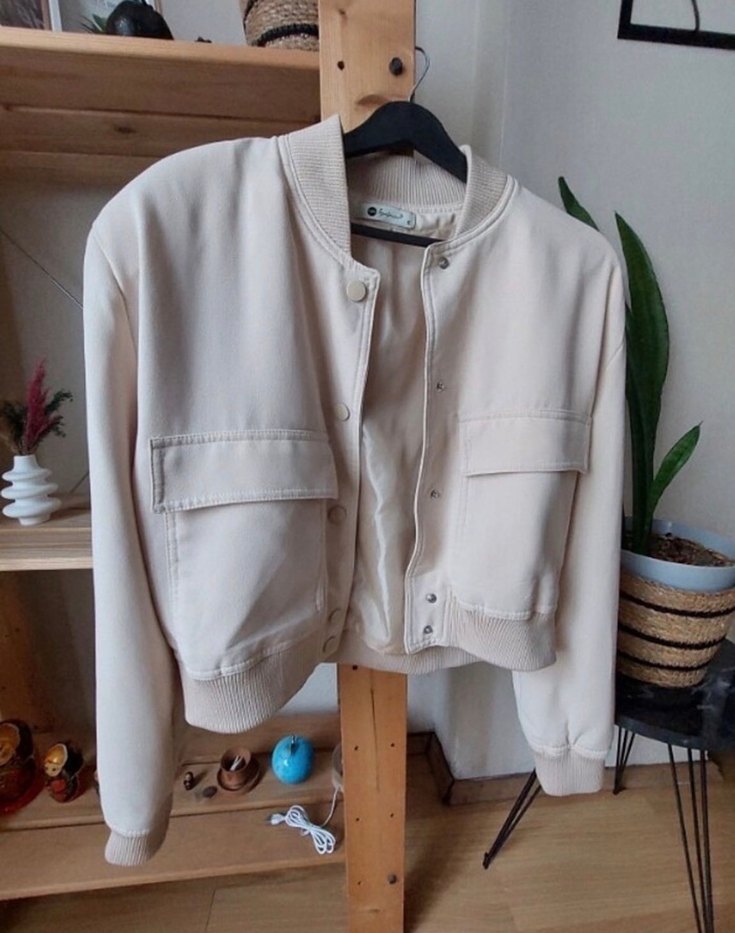 Düğmeli, uzun kollu, pamuklu beyaz midi ceket. Gevşek kesimi ve yakası minimalist tarzda, günlük kullanıma uygun.