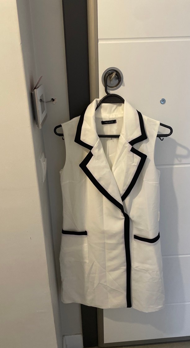 Düğmeli önü ve siyah şerit detayları olan beyaz, kolsuz, notched yaka midi elbise