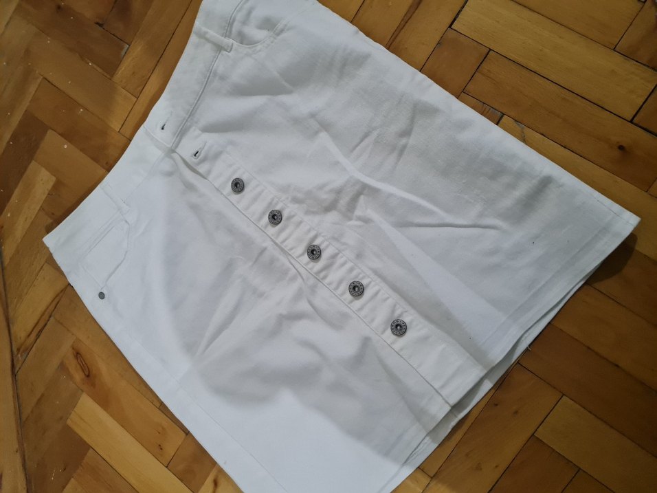 Düğmeli beyaz midi etek, pamuklu ve rahat kesimlidir. Minimalist, desensiz tasarımıyla günlük sokak stiline uygundur.