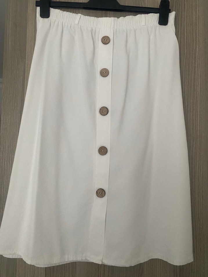 Düğmeli beyaz midi etek, bol kesim, bek kısmı lastikli ve yumuşak sentetik kumaştan yapılmıştır. Minimalist bohem tarzıyla günlük kullanıma uygundur. 1 veya 2 kez giyildi. Temizdir. Ön kısım düğmeler dekordur. İç kısmında astar yok kumaş keten tarzdadır. (Ürünler ertesi gün kargolanmaktadır) Ürün görsellerindeki 2. fotoğraflar tarafımdan çekilmektedir. Pazarlık payı yok maalesef Anlayışınız için teşekkür ederim