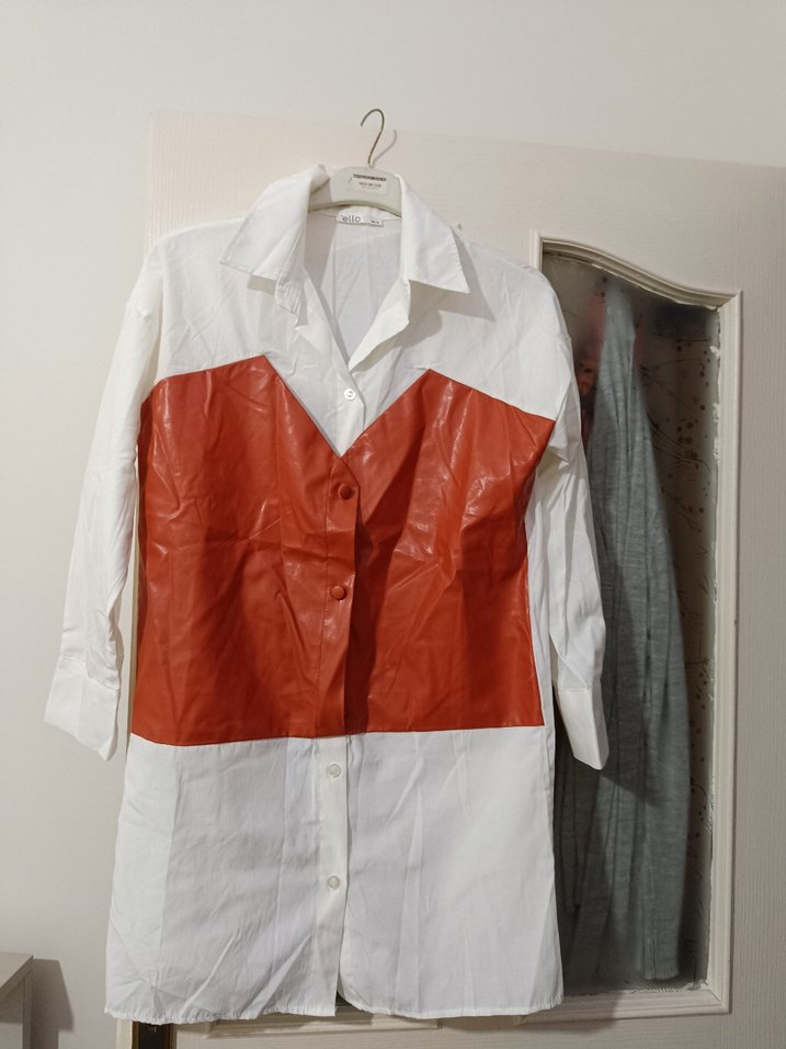 Beyaz, uzun kollu, düğmeli ve yakalı bu gömlek, turuncu panel detayıyla salaş kesim sunar. Günlük kullanıma uygundur.