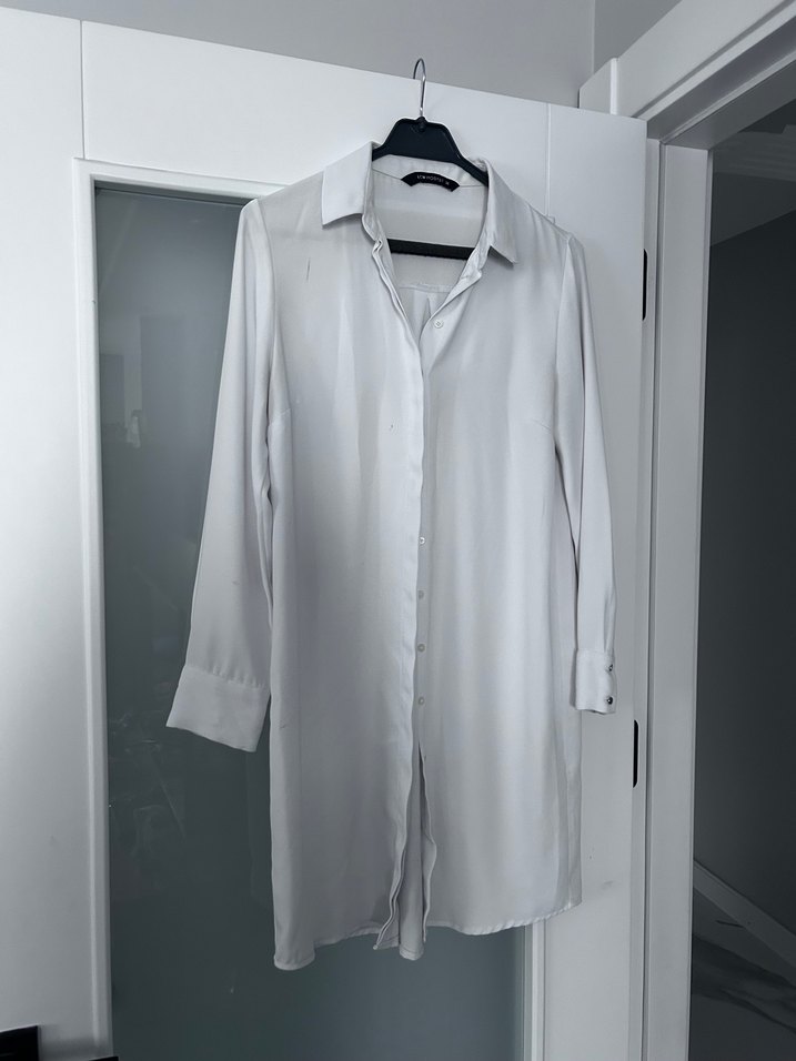 Düğmeli, uzun kollu, beyaz renkte midi kadın gömlek. Salaş kesimi ve yakalı tasarımıyla rahat bir görünüm sunar.