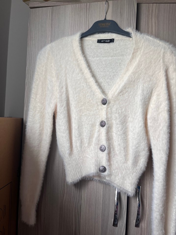 Beyaz yün dokusuyla, düğmeli ve V yakalı uzun kollu, salaş kesim midi kadın hırka. Günlük kullanıma uygun, rahat ve şık bir sokak stili parçası.