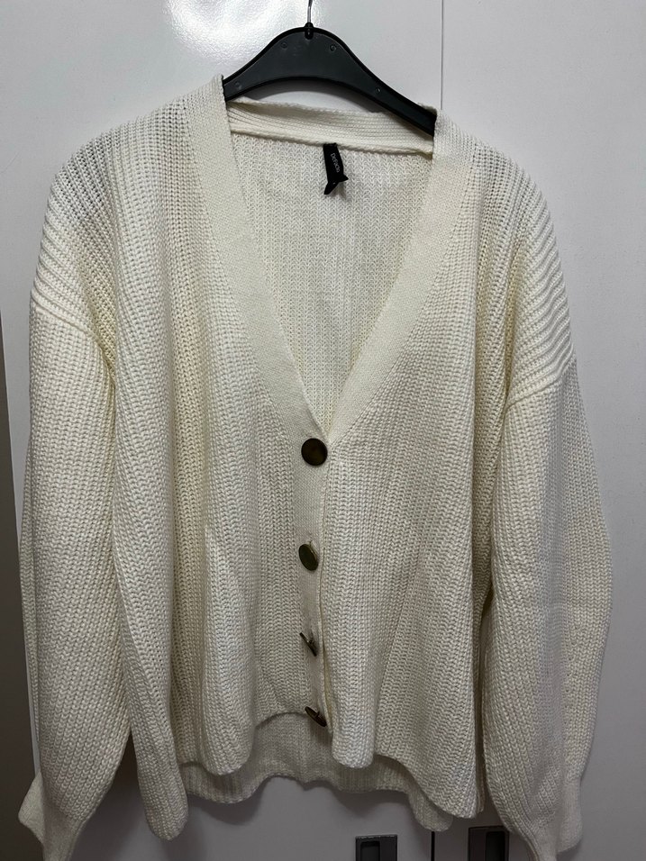Düğmeli, uzun kollu, beyaz örme hırka. Notlu yaka ve bol kesim ile günlük kullanıma uygun, rahat bir stil sunar.