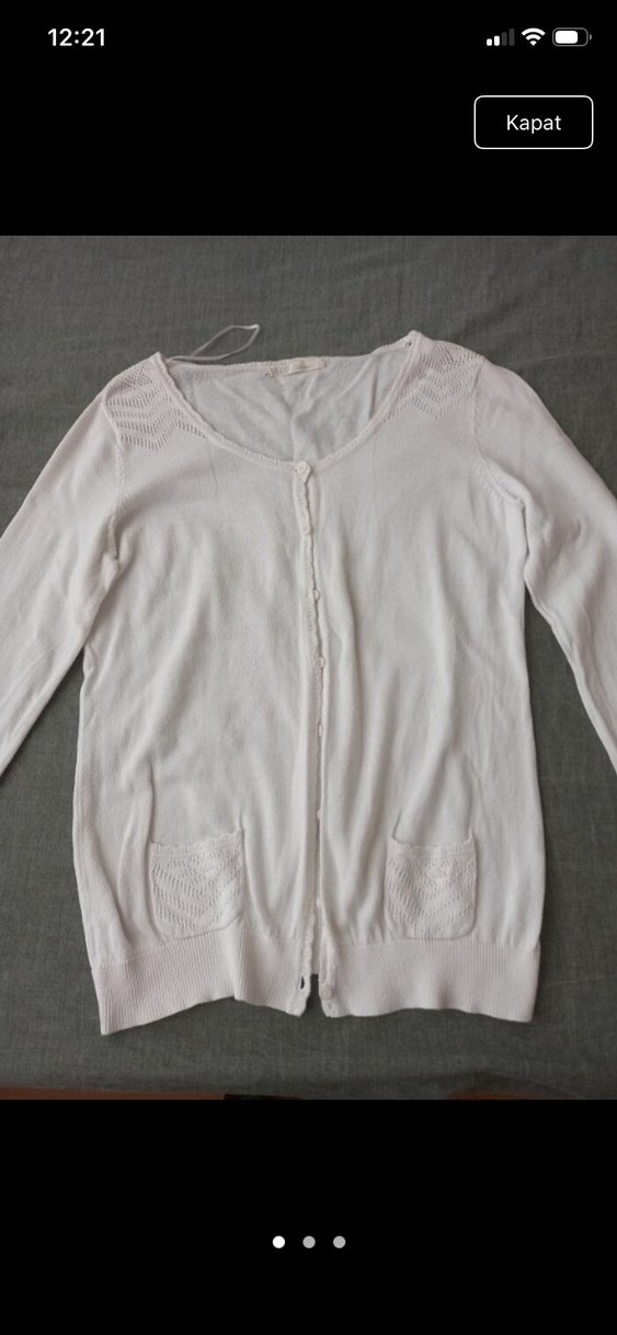 Beyaz renkli, düğmeli, uzun kollu ve yuvarlak yakalı örme kadın hırka. İki ön cepli, salaş kesim ve midi boyda, günlük kullanım için uygun bohem tarzda.