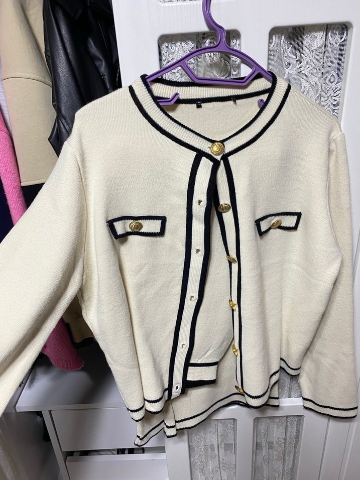 Düğmeli, uzun kollu, bol kesim beyaz örme hırka. Siyah şerit detayları ve yuvarlak yakasıyla günlük sokak stiline uygun. Takım m l olur 168 boy 65 70 kiloya giyildi