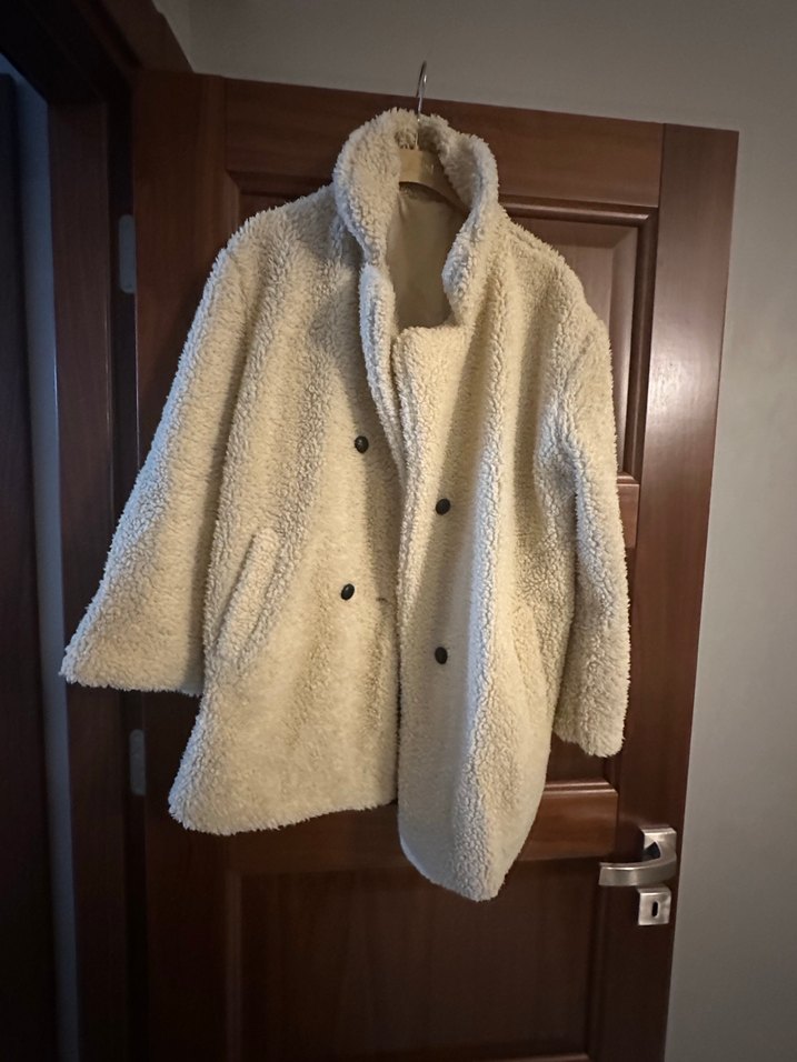 Düğmeli, beyaz midi uzunlukta kadın kaban, yumuşak ve rahat kumaştan. Notlu yaka ve uzun kollu, bol kesim, gündelik kullanım için uygun.