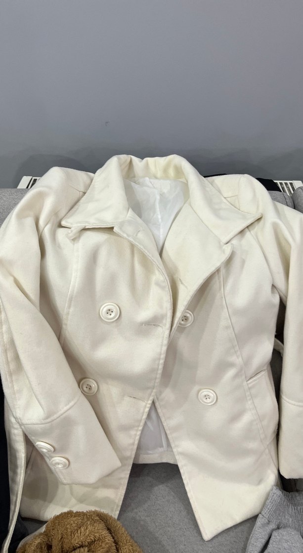 Düğmeli önü ve sivri yaka detayıyla beyaz midi kaban. Sentetik kumaştan, regular fit ve uzun kollu, ofis ve günlük kullanıma uygun. ✨