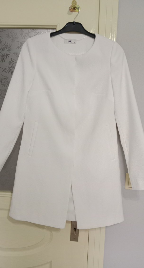 Düğmeli, yakalı beyaz kadın kaban, uzun kollu ve midi boydadır.