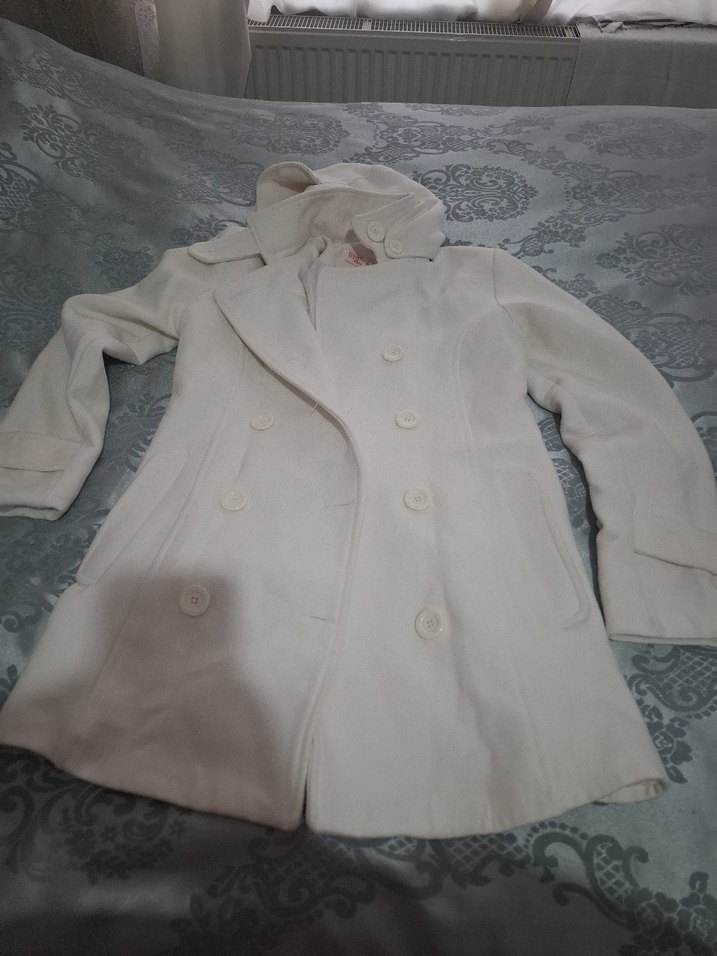Düğmeli önü ve uzun kollu, beyaz renkli, yumuşak ve sıcak kumaştan yapılmış midi boy kadın kaban. Trendy ve rahat sokak stiline uygun.