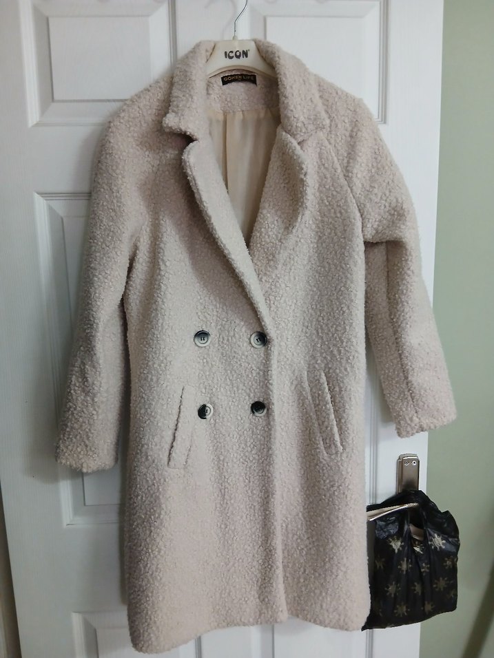 Düğmeli, ekru midi uzunlukta kadın kaban. Notch yakalı, uzun kollu ve bol kesim. Yumuşak ve sıcak kumaştan üretilmiştir. Günlük kullanıma uygun rahat stil. ICON marka.98 cm uzunluk