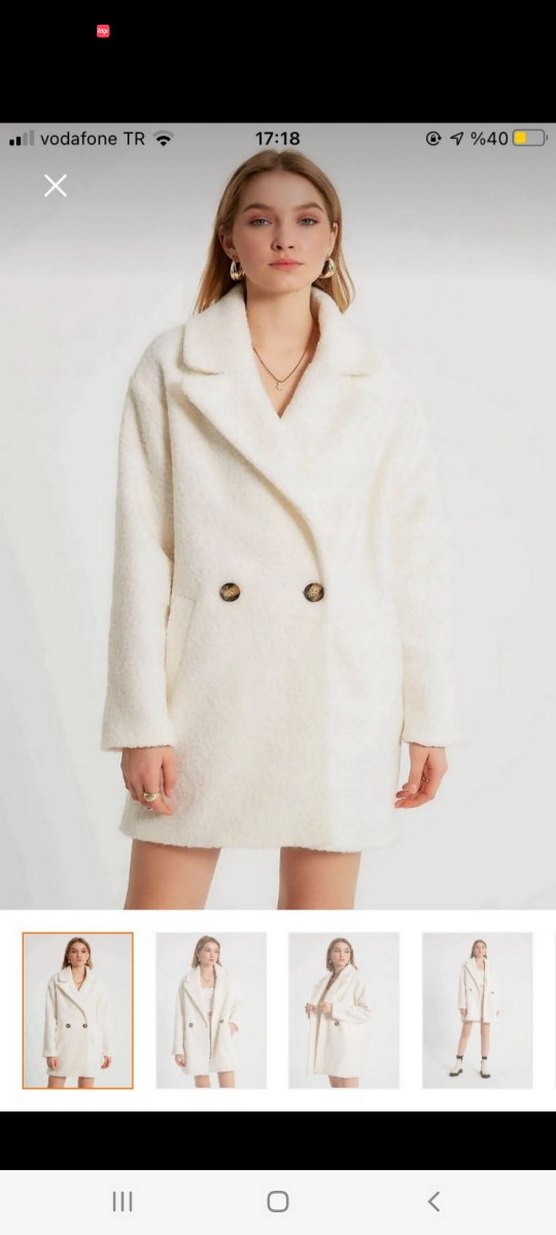 Düğmeli beyaz midi kaban, yakalı ve uzun kolludur. Yumuşak ve sıcak kumaştan yapılmış, bol kesimdir ve günlük sokak stiline uygundur.
