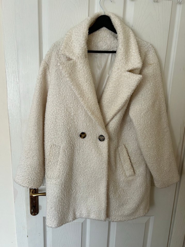 Düğmeli, beyaz midi kadın kaban notched yaka ve uzun kolludur. Rahat kesimi ve yumuşak, sıcak kumaşıyla günlük sokak stiline uygundur. Çok az giyildi hiç defosu yok rengi bembeyazdır isteyene video atabilirim