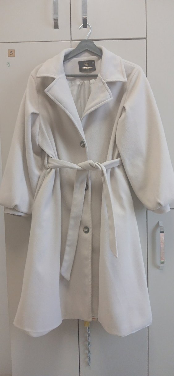 Düğmeli, kuşaklı beyaz midi uzunlukta kadın kaban. Yumuşak ve sıcak kumaştan, klasik ve şık ofis kullanımı için uygun.