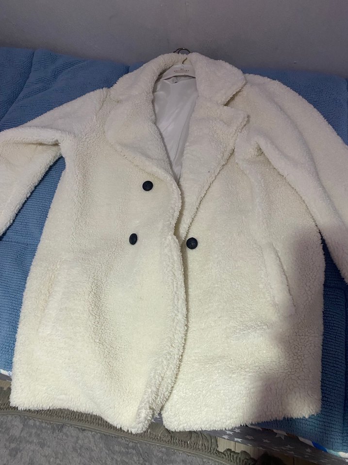 Beyaz midi uzunlukta, düğmeli ve kesik yaka detaylı kaban. Yumuşak ve sıcak kumaştan üretilmiş, uzun kollu ve bol kesimdir. Rahat ve günlük kullanıma uygun, pastel tonlarda. ❄️