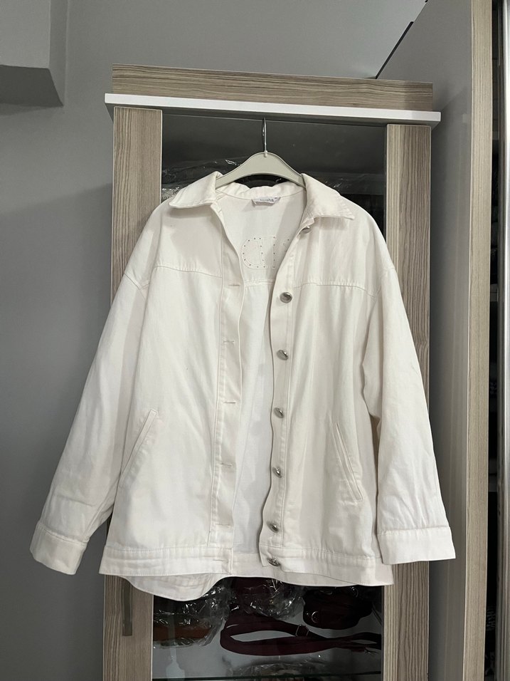 Düğmeli ön kısmı, uzun kollu ve kesik yakalı beyaz keten ceket. Rahat kesimi ve midi boyu ile günlük sokak stiline uygundur.