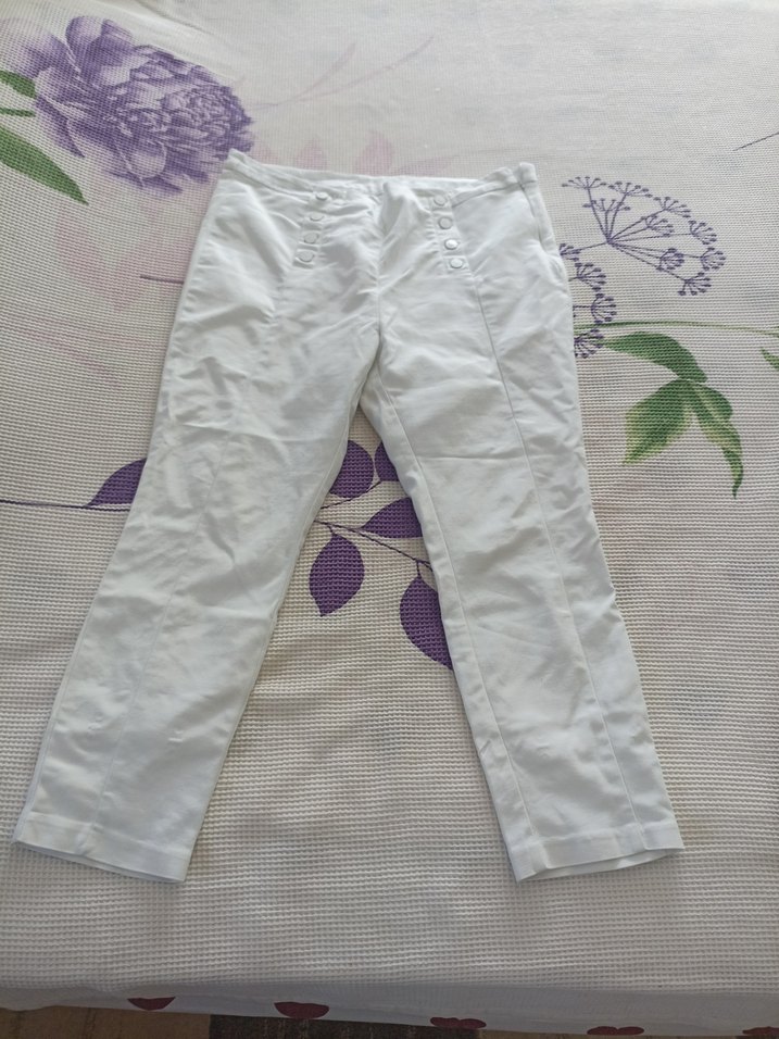 Düğmeli, beyaz pamuk kumaştan, midi boy, normal kesim kadın pantolon. Günlük ve sokak stili için uygundur.