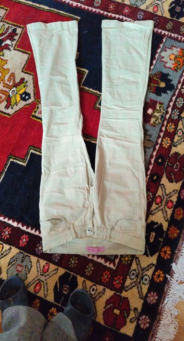Düğmeli detaylara sahip beyaz midi uzunlukta, bol kesim kadın kumaş pantolon. Günlük sokak stili için uygundur.