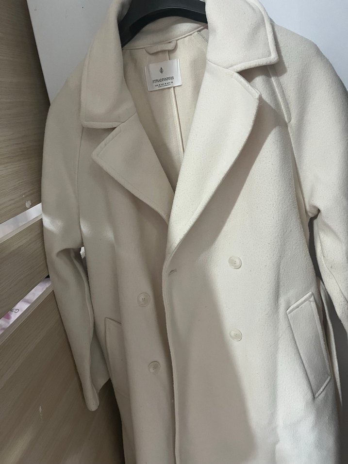Düğmeli, normal kesim, uzun kollu beyaz kadın palto. Yumuşak ve sıcak kumaştan, minimal ve normcore tarzda, ofis için uygun. ❄️