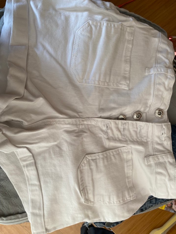 Pamuk kumaştan yapılmış, düğmeli ve yakalı, beyaz, midi boy, fitted kesim kadın şort. Rahat ve gündelik sokak stili için uygundur.