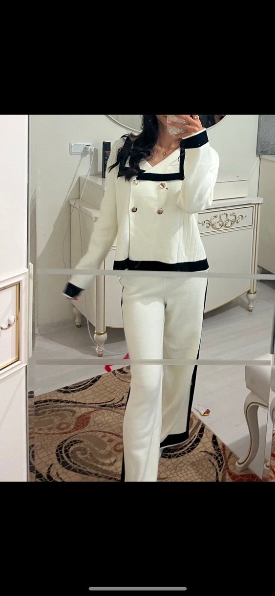 Düğmeli ve kesik yakalı kadın takım elbisesi, pürüzsüz sentetik kumaştan üretilmiştir. Beyaz renkte, siyah baskılı detayları vardır. Uzun kollu, normal boy ve rahat kesimdir. Ofis için uygundur.