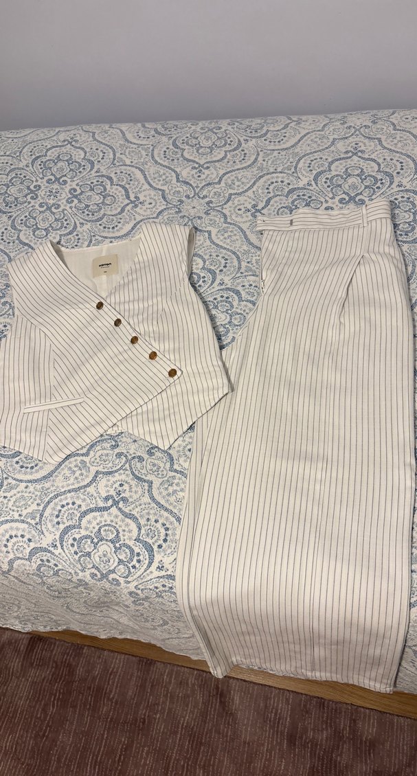 Pamuk kumaştan beyaz, düğmeli ve kolsuz ceket ile normal kesim midi boy pantolon içeren kadın takımı. Ofis için uygun, nakış detaylı, normcore tarzda.