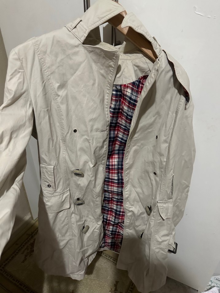 Düğmeli, beyaz midi uzunlukta, bol kesim kadın trençkot. Uzun kollu, kesik yakalı ve sentetik kumaştan üretilmiştir. İç astarı ekose desenlidir. ️