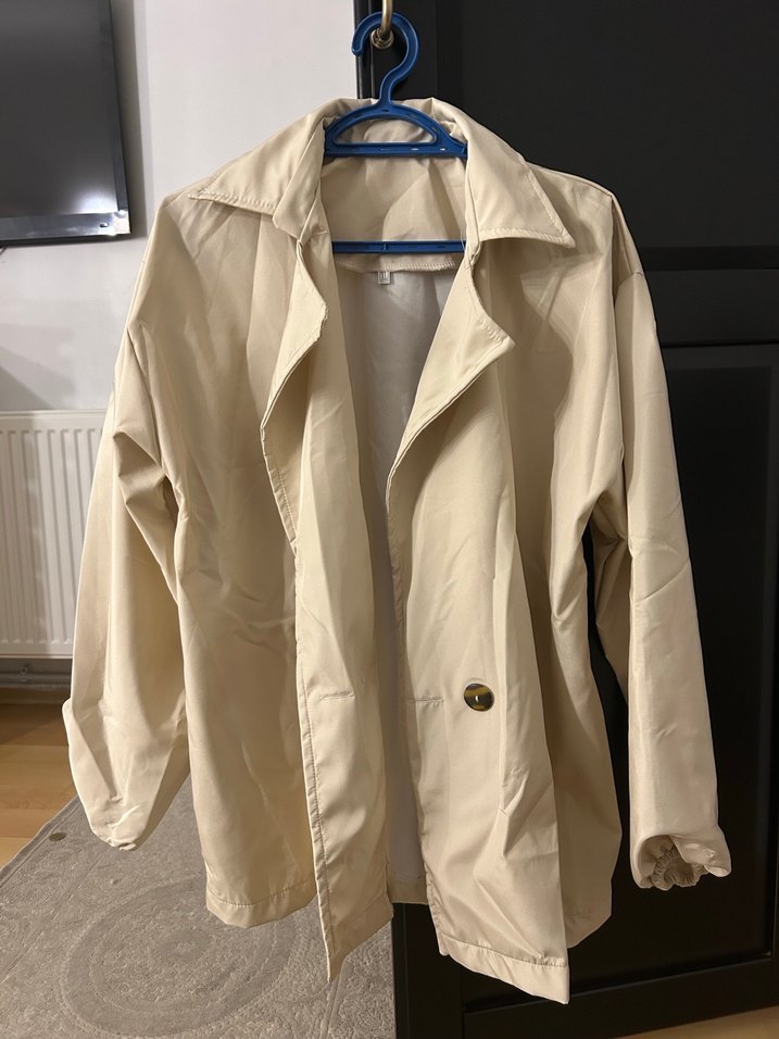 Düğmeli ve yakalı beyaz midi trençkot, keten kumaştan, bol kesim ve uzun kolludur. Günlük sokak stiline uygundur. Trendyoldan alındı hiç giyilmedi S-XL bedene kadar uygundur