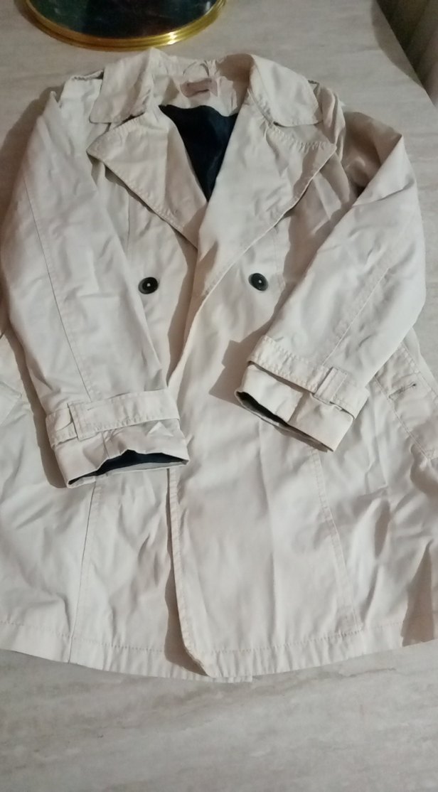 Beyaz midi uzunlukta, düğmeli ve kesik yaka detaylı kadın trençkot. Keten kumaştan, uzun kollu ve rahat kesimlidir. Günlük sokak stiline uygundur.