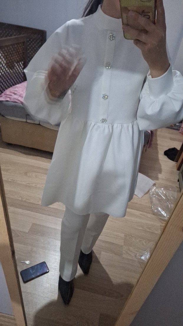 Düğmeli ön kısmı ve kesik yakasıyla uzun kollu, bol kesim beyaz midi tunik. Yumuşak sentetik kumaştan üretilmiş, trend casual stil için uygun.
