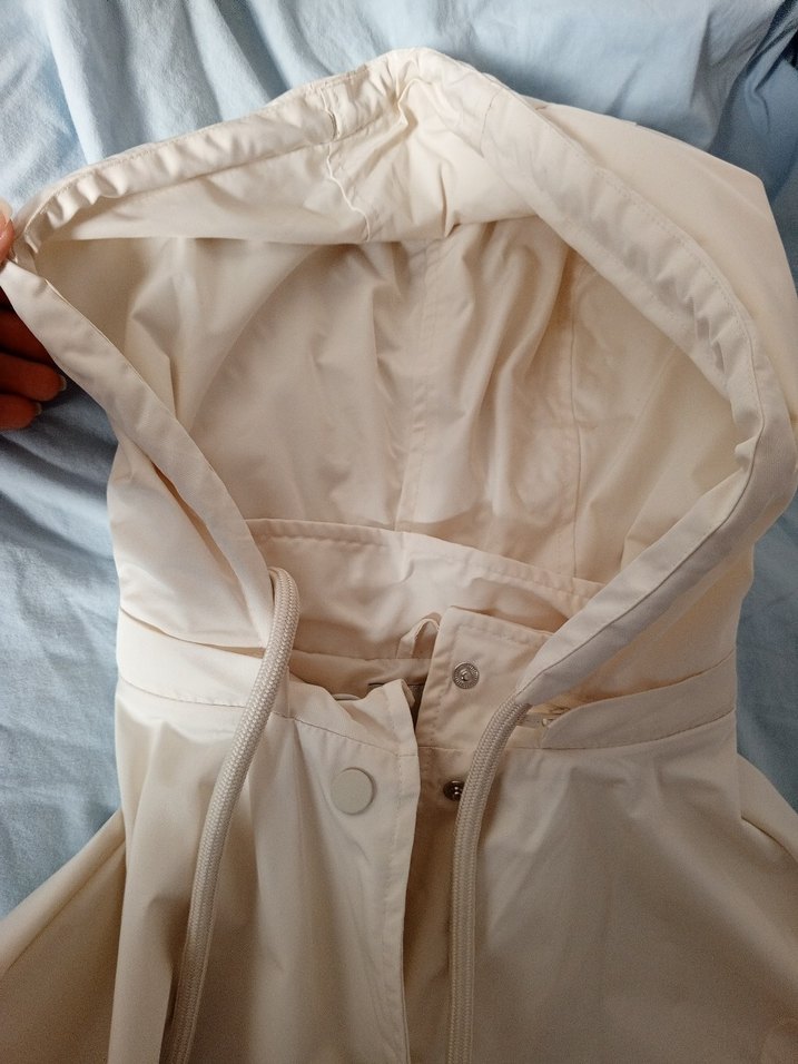 Bu beyaz midi yağmurluk, düğmeli ön ve kolsuz tasarıma sahiptir. Sentetik kumaştan üretilmiş, not detaylı yakası ve bol kesimiyle dış mekan kullanımı için uygundur. ️