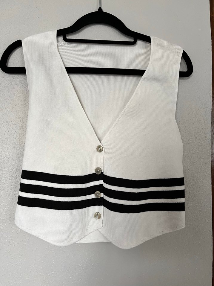 Düğmeli, V yakalı, beyaz ve siyah çizgili midi uzunlukta, kadınlar için fitted yelek. Sokak stiline uygun, günlük kullanıma elverişli.