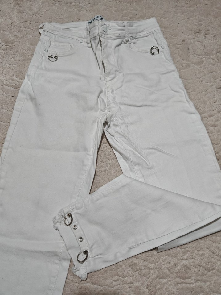 Düğmeli detaylara sahip beyaz kot pantolon, normal boy ve slim fit. Günlük sokak stili için uygundur. ⚡