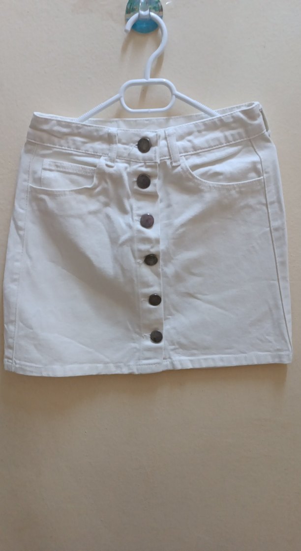 Düğmeli beyaz midi mini etek, kot kumaş Günlük sokak stili için uygundur. önü düğmeli cepli boyu 40 çok rahat ve şık tertemiz sorunsuz