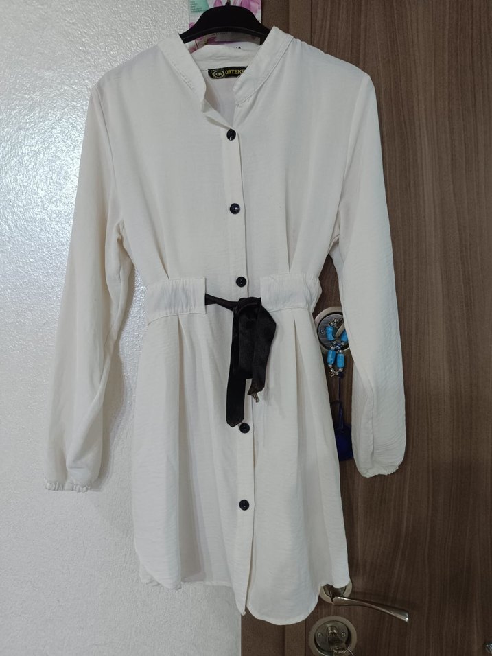 Düğmeli, uzun kollu, beyaz pamuklu tunik. Siyah bel bağı ile rahat ve şık, günlük sokak tarzına uygun.
