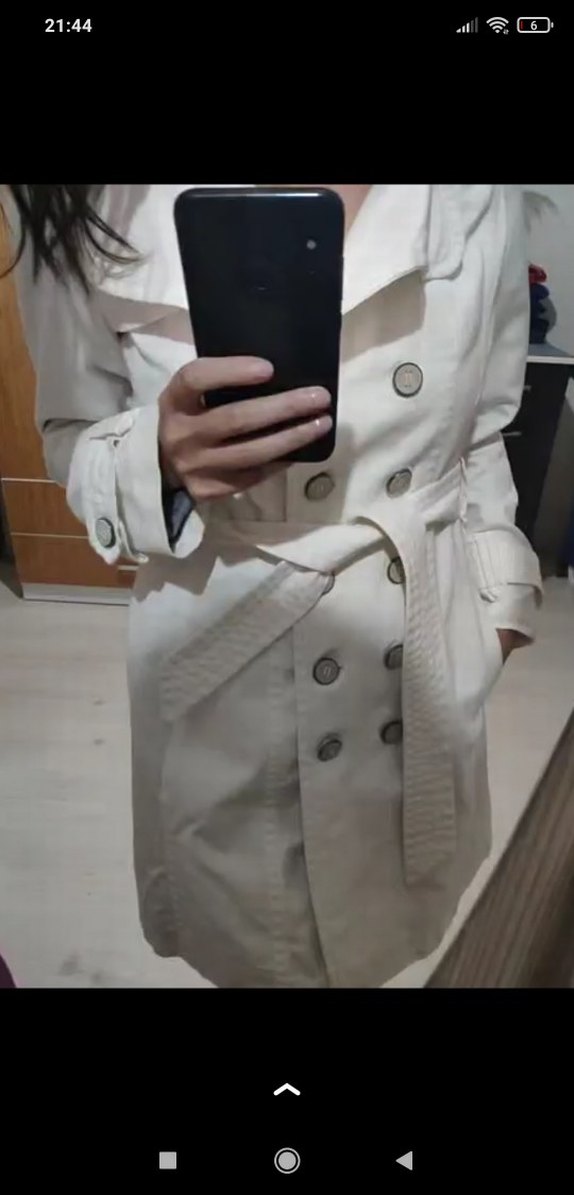 Düğmeli ve kuşaklı beyaz midi trençkot, normal kesim ve uzun kolludur. Notlu yaka ve düz sentetik kumaştan yapılmıştır, günlük sokak stiline uygundur.