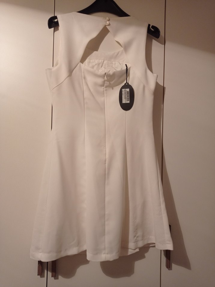 Kolsuz beyaz midi elbise, V yaka ve düğme detaylarıyla ofis için uygun, vücuda oturan kesime sahiptir.
