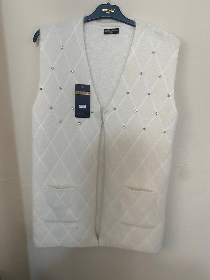Düğmeli, yakalı, cep detaylı beyaz midi yelek, rahat kesimi ve sıcak dokusuyla günlük sokak stiline uygun.