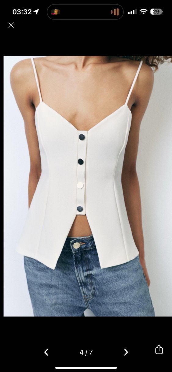 Düğmeli, V yakalı beyaz denim büstiyer, kısa ve regular kesimle günlük şıklık sağlar.